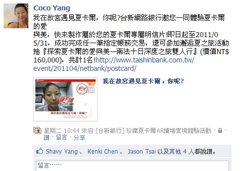 最近在剛結束的故宮夏卡爾展中,運用了AR擴增實境的創意,與場外民眾進行了「夏卡爾之約」的活動,活動現場大排長龍,民眾只要拿起AR MARK對著WEBCAM即能和最喜愛的夏卡爾作品進行AR互動體驗合照,並將體驗照片印成精美明信片做為參加展覽的紀念,最特別的是能將體驗照片即時上傳至個人的FB塗鴨牆和親友們分享。而未能實際來看展的民眾,則可到主辦單位的活動網頁登入,一樣能進行與夏卡爾體驗合照的樂趣。